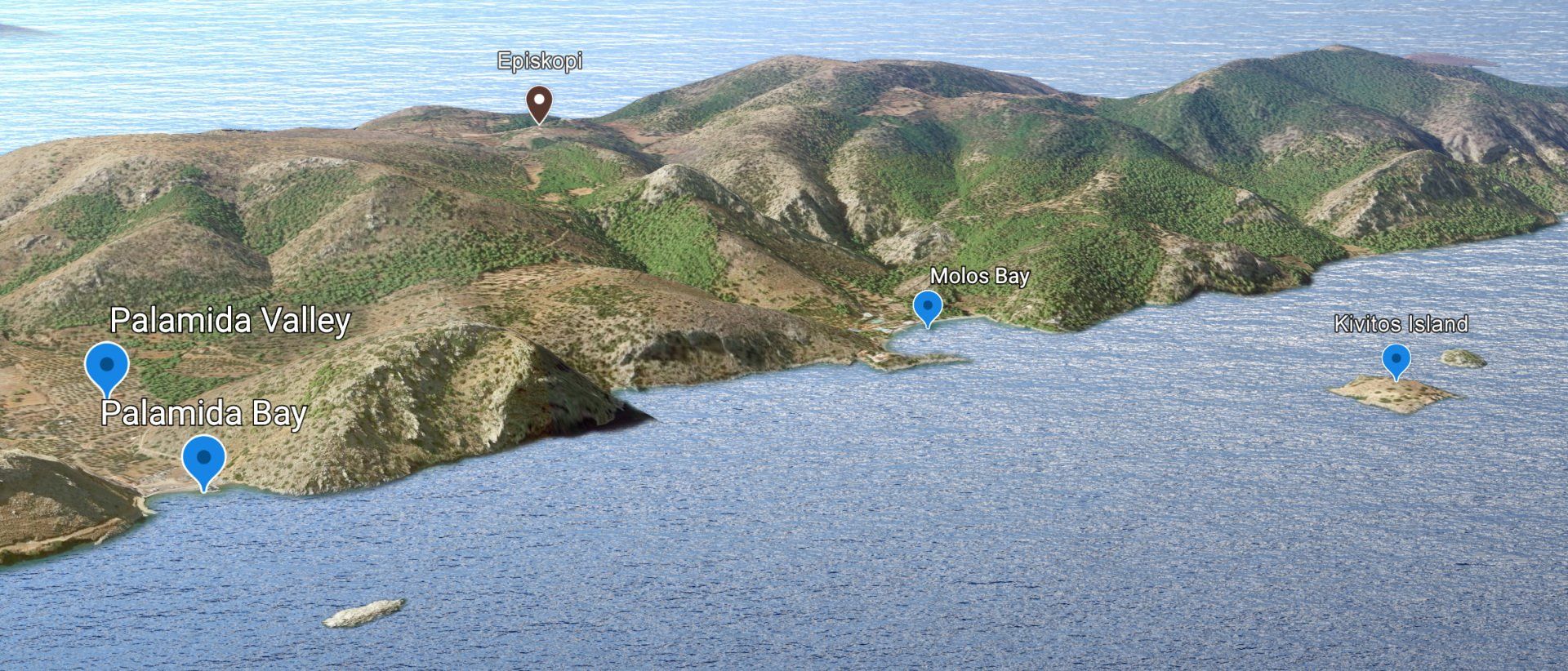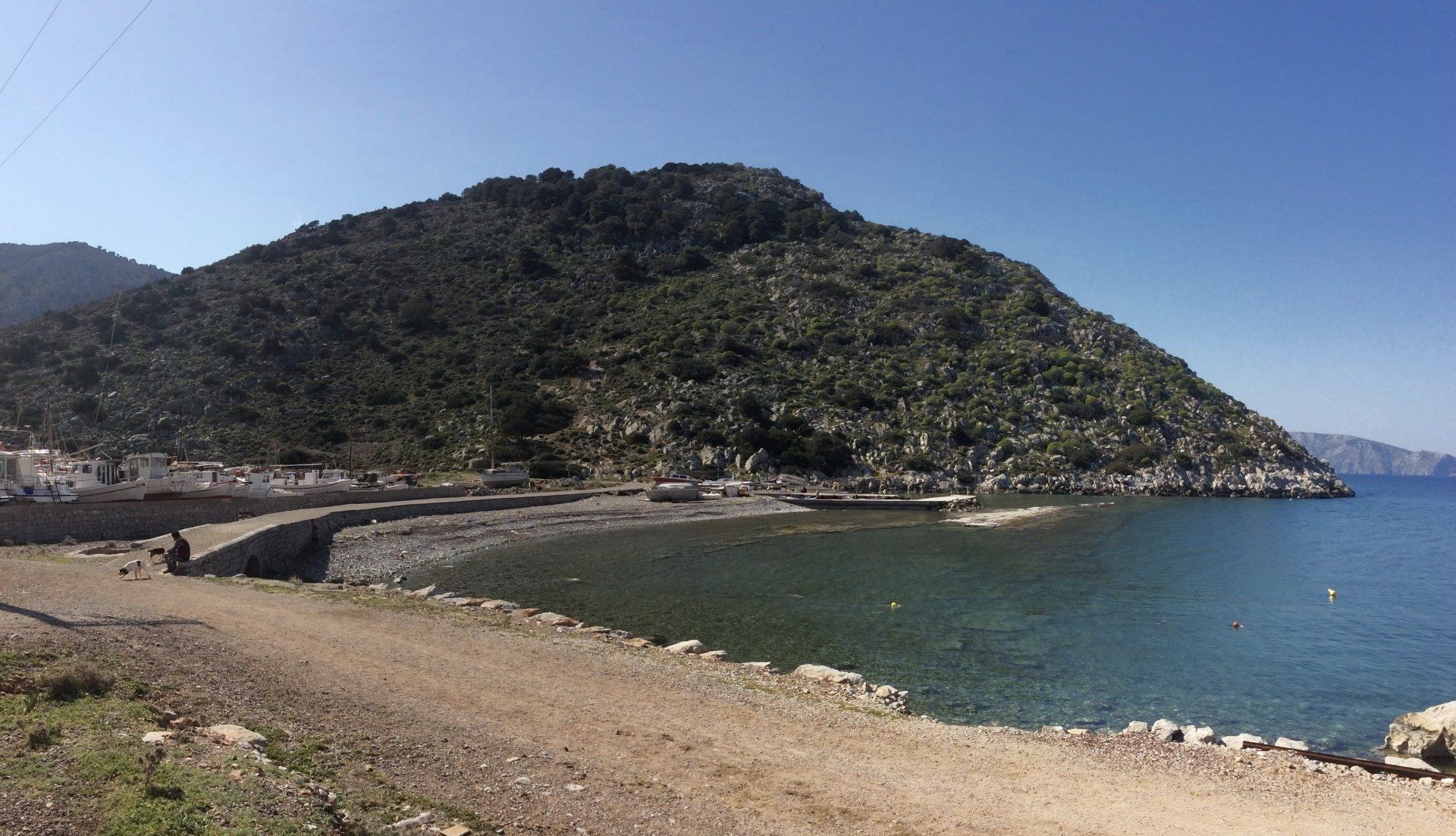 Palamida nestles in a fairly large valley with a 'flat bottom' protected on all sides by gentle rocky hillsides. Palamida is the 'gateway' to the much greener west end of Hydra Island.