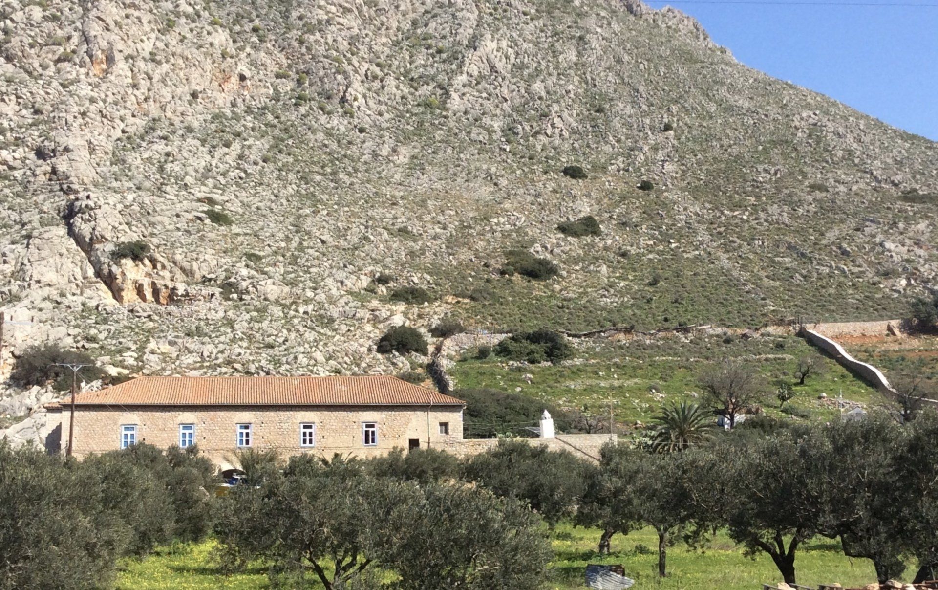 To the east side of the boatyard, there is a massive farmhouse that has been in the Voulgaris family for many generations. Much of the flat valley area to the back of the boatyard is operated by the family with a massive 'working' olive grove. The olives are generally picked during October/November, bagged and shipped to Ermioni for pressing and then returned to the island where the oil is distributed to the contributors and some is sold at a few Hydra shops.