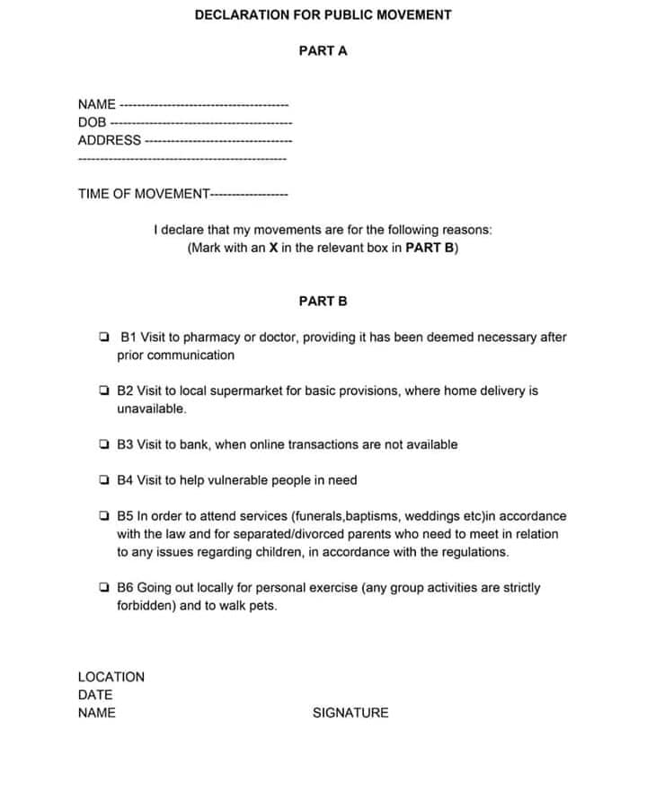 From 6am tomorrow (23/3/2020) and for each occasion, anyone leaves their home, each person must have documentation and ID/Passport WITH THEM stating the reason for being out of their home. They must be able to provide the police or authorities with the form and ID when requested or will get an immediate fine of €150.