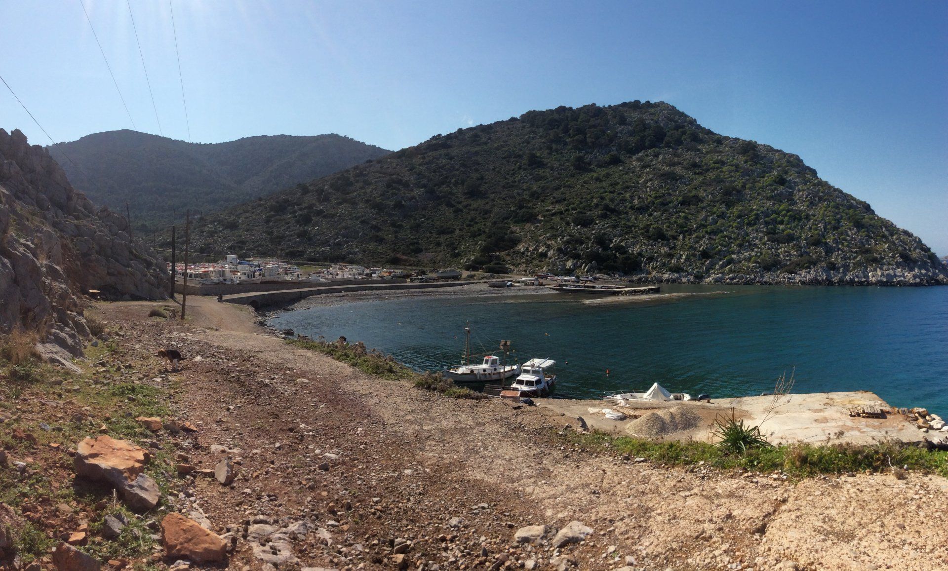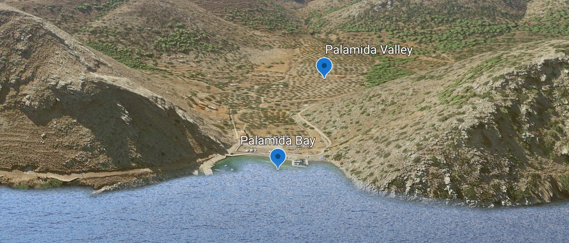 Palamida nestles in a fairly large valley with a 'flat bottom' protected on all sides by gentle rocky hillsides. Palamida is the 'gateway' to the much greener west end of Hydra Island.